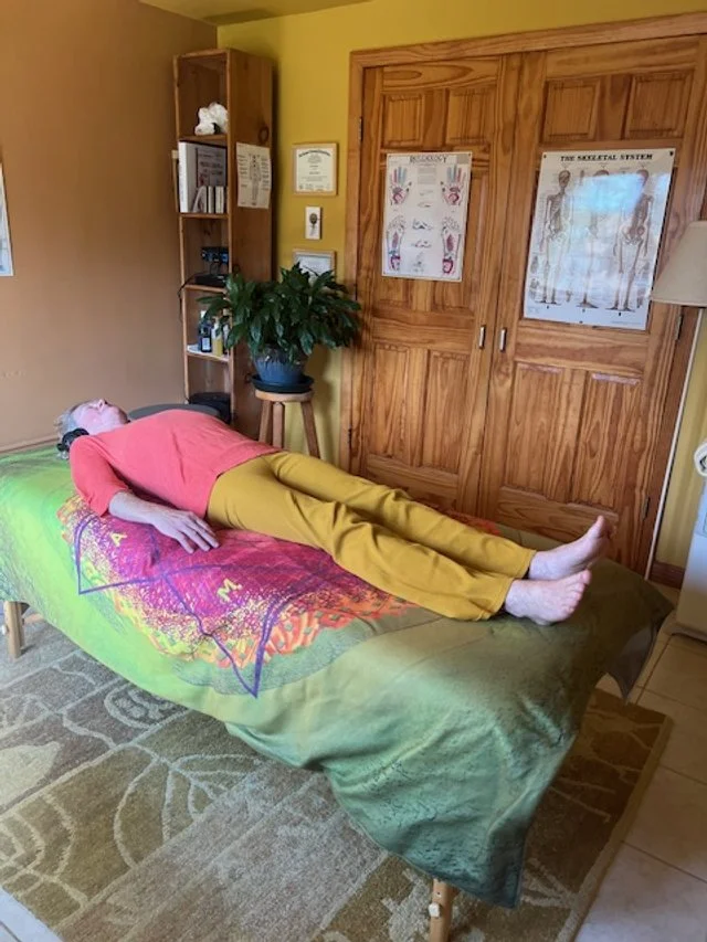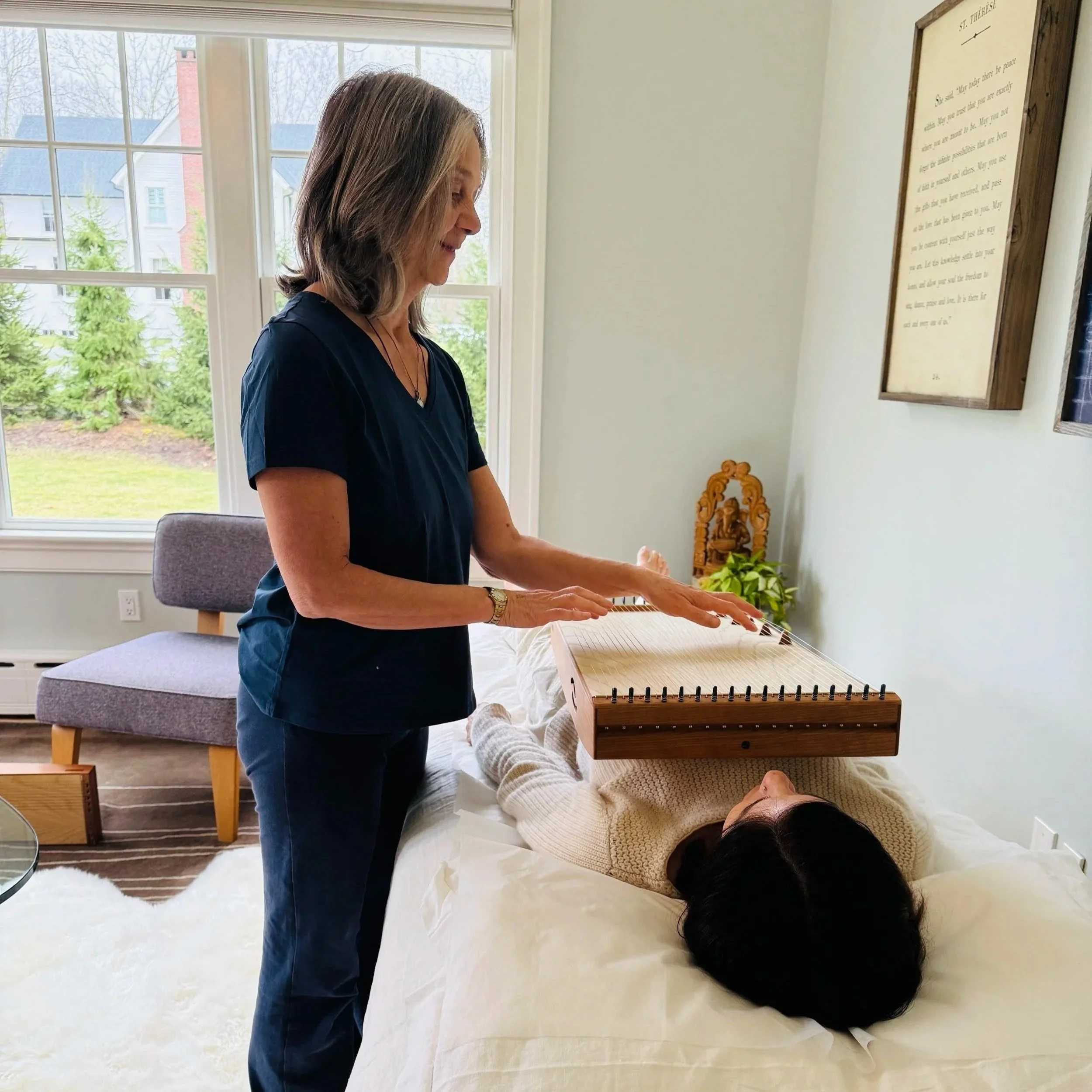 a monochord on your chest and belly lulling you into a deep, transformative theta state